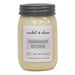 Farmhouse Kitchen Jar Candle, 12oz is a pint-sized jar candle with a gray metal screw-on lid. It has a single lead-free wick and features premium soy wax with pure essential oils for a highly aromatic and clean burning finish. Candle is proudly hand-poured in the USA and has an estimated burn time of 84 hours. Candle has notes of citrus and spices and looks great enclosed in a candle ring.