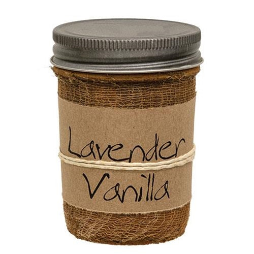 Lavender Vanilla Jar Candle is a 8 oz. candle made from clean-burning wax. Candle has a primitive design with a muslin wrapping, a brown paper labe...