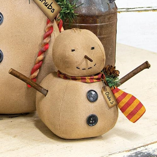 Chubs Jr. Snowman is a freestanding snowman doll with a dark, stained fabric finish. Snowman features a string hanger, stick arms and nose, black b...