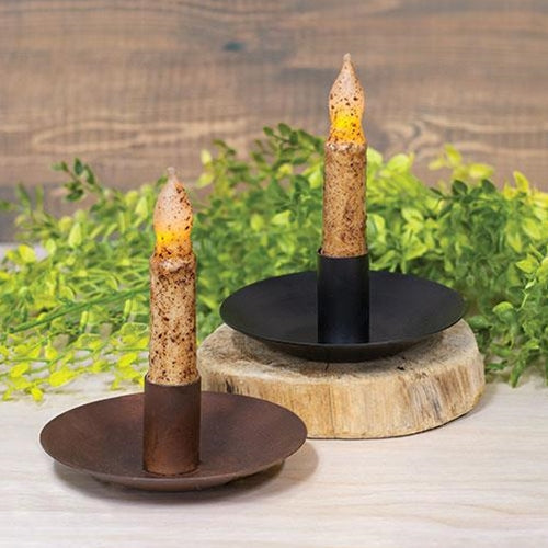 The Colonial Taper Holder is a metal taper candle holder featuring an antiquated rust-colored finish and a smooth, round bowl shape with a round at...