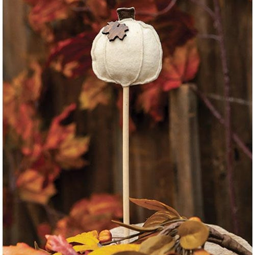 Cream Pumpkin Felt Poke is a stuffed fabric pumpkin on a wooden dowel. It is ribbed for detail and features a brown top and a cut-out leaf accent. ...