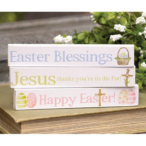 The Jesus Mini Sticks are an assortment of three petite decorative white wooden quote sticks with natural worn edges and a pastel Easter theme. One...