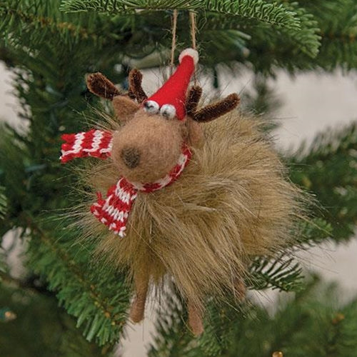 The Fuzzy Reindeer Felted Ornament is a decorative plush Christmas ornament made of brown felt fabric and long brown and black faux fur. The reinde...