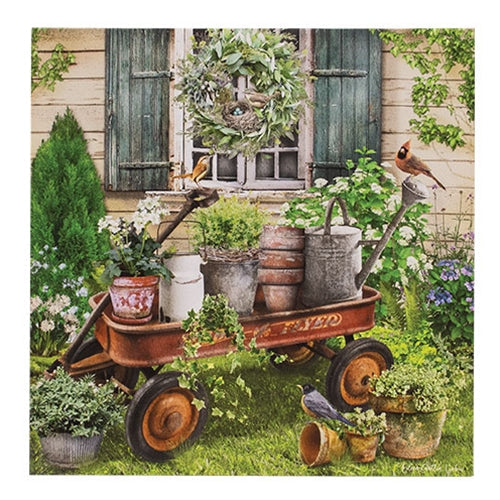 The Vintage Garden Wagon Print is a decorative canvas artwork print depicting a charming springtime scene. The print features a shuttered window wi...