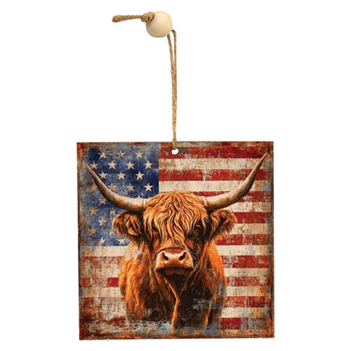The Vintage Flag with Highland Bull Ornament is a patriotic accent perfect for a holiday tree or hanging decor. Made from wood, the ornament featur...