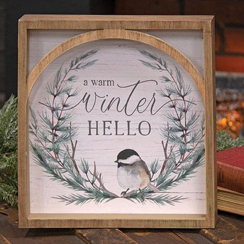 Warm Winter Hello Frame is a wooden sign with an unpainted and decorative frame. Sign comes ready for mounted display by a pre-installed sawtooth h...