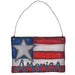 Wooden America Flag Doodle Ornaments bring a playful patriotic touch to hanging decor. Made from wood, each ornament features an imperfect rectangle shape with an unfinished back and dark stained sides. Doodle style design on the front of each ornament depicts a representation of the US flag in dimensional red, blue, white, and gray colors. One of the ornaments reads “America” in bubbly blue letters. A black wire hanger completes each ornament, allowing for easy display. Each measure 2.75” high by 4” wide by .25” deep.