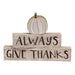 Always Give Thanks Pumpkin Blocks is a set of three wooden blocks perfect for decorating tabletops for Fall. The set includes two quote blocks, "Always" and "Give Thanks", each natural wood with distressed white paint. The "Always" block measures 1.5" tall by 5" wide by .75" deep and sits well on top of the "Give Thanks" block, which measures 1.5" tall by 7" wide by .75" deep. The third block displays a simple white pumpkin. The pumpkin measures 2" tall by 2" wide by .75" deep and stacks well on top of the quote blocks or can sit on its own.