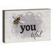 Bee You Tiful Block is a freestanding wood block with black sides and a playful phrase. It has a bee accent and black text over a white and gray background and reads, "beautiful" in a play on words. A bee accent is used in place of the, "be" and, "youtiful" completes the design. It is perfect or accented desks, shelves, and mantels and measures 2.75" high by 4.25" wide.