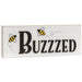 Buzzed Wooden Block is a rectangular wooden block with a white finish and exposed edges. Block reads, "buzzed" in dimensional black text and it is accented by two buzzing bumble bees. Measures 3" high by 7.75" wide by .75" deep.