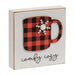 The Comfy Cozy Block is a decorative wooden block with a white painted finish and natural worn edges. The block reads "comfy cozy" in black scripted lettering and features a coffee mug graphic with a red and black buffalo check pattern and a white snowflake figurine. Display this block freestanding on a riser, shelf, or table to give a simple and rustic touch to the home during Winter and Christmas. Measures 3.5" by 3.5" and .75" deep.