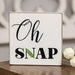 Oh Snap Square Block is a humorous wooden block sign with a distressed white finish and exposed edges. It reads, "oh snap" in black text with a cut-out pea accent on top of the N. Block is freestanding and looks great on a shelf or tabletop. Measures 5" high by 5" wide by .5" deep.
