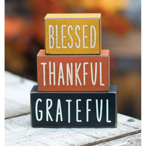 Blessed, Thankful, Grateful Stacked Blocks is a set of three stacked wooden blocks featuring a distressed, autumnal style. One block is yellow and ...