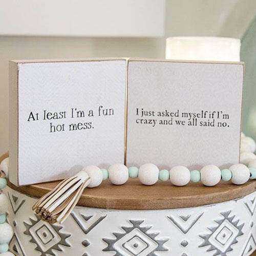 Fun Hot Mess Square Block is an assortment of two white wooden blocks featuring subtle chevron and swirl patterns and black lettering. One block re...