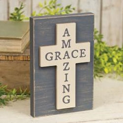 The Amazing Grace Cross Block is a decorative wooden sign featuring a distressed gray paint and natural worn edges. The sign displays an ivory wood...