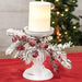The Snow Sprinkled Pillar Holder is a decorative pillar candle pedestal with a white finish and worn vintage detailing. The holder features a pine greenery piece, complete with bright red berries and a coat of thick white flocking for a fresh snowfall look. Pair this holder with a pillar candle and display atop a shelf or table for a beautiful, festive accent in the home during Winter and Christmas. Measures 7” high and 4.25” in diameter. Holds any pillar candle up to 3.5” in diameter.  Candle sold separately.