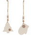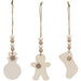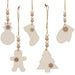 Beaded Wooden Stitched Snowflake Christmas Ornaments are a set of unique hanging decor pieces featuring festive design. Each ornament features a white finish with a beige stitched-look edge. One ornament depicts a snowman, one depicts a mitten, one a Christmas tree, one a stocking, and one a gingerbread man. Each is accented by a small snowflake cutout and a jute rope hanger strung with four wooden beads. Each measures approximately 4" high by 2" to 3.5" wide by .5" deep.