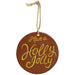 Holly Jolly Ceramic Ornament is a round ceramic Christmas ornament. Ornament has a burgundy glazed background that is stamped with the phrase, "Have a Holly Jolly," in gold lettering. Hangs on a jute cord. Measures 4" in diameter by .25" deep.