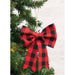 Red Black Buffalo Check Bow Clip Ornament features stiff fabric construction with a red and black buffalo check pattern. Ornament has a jute rope for hanging display and it features a metal clip for attaching to wreaths, containers, or floral arrangements. Measures 6" high by 5" wide.
