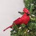 The Feathered Cardinal Clip is a decorative cardinal bird figurine made of bright red feather material. The bird is complete with bead eyes, an orange beak, a long feathery tail, and includes a silver metal clip on the bottom for a secure attached display. Use this cardinal to adorn a tree, garland, wreath, or other greenery during the Winter and Christmas season for a colorful nature-inspired accent. Measures 4.5” high by 12” wide by 2” deep.