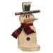 The Rustic Wood Top Hat Snowman Jar Candle Sconce is a unique display piece crafted from wood with layered, distressed design. The sconce depicts a classic snowman wearing a black top hat and a red and black plaid scarf. An orange carrot nose and black buttons, eyes, and brows give the snowman a familiar look. The snowman has an off-white painted finish and features a ledge perfect for holding a jar candle or small vase. Measures 9.75” high by 4” wide by 4.25” deep.