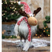 Small Plush Furry Wobble Moose with Red Hat is a freestanding moose doll with a festive twist. Moose has a plush nose, ears, and antlers and two fuzzy white eyes with black bead pupils. Moose wears a red and white knit hat with a matching scarf and its hat is wired for adjustments. Moose has long metal legs with fur cuffs on its ankles and its metal body is covered with matching black and white fur. Moose is set on springs and it can be pushed down for a wobble effect. Measures 9.5" high by 4" wide by 7.5" deep.