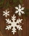 Snowflake Ornament is a wooden ornament in a cutout snowflake design. Item is painted ivory and coated with glitter. Hangs on a rusty wire and measures 10" in diameter.