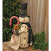 The Stanley Stuffed Candy Cane Goody Bag Snowman is a decorative winter plush with charming vintage style. The snowman has a fuzzy off-white fabric finish and a weighted bottom for freestanding display. He wears a suit of snowman print fabric with black and cream striped sleeves, complete with rusted jingle bell pins, a black felt top hat, and a long black scarf. The snowman holds a beige burlap gift sack with a tall yarn-wrapped candy cane sticking out, accented by green burlap leaves and rusted jingle bells. His face features beaded eyes, an orange carrot nose, and a tiny jingle bell smile for a friendly look. Measures 21” high by 6” in diameter.