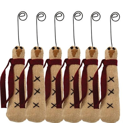 Skinny Snowman Ornaments sell as a set of six primitive, plush snowman ornaments. Each snowman has stitched features and wears a red felt scarf. A ...