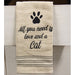 Cat lovers, this one is for you! Get your hands on our Love and Cat Dish Towel to show how smitten you are with your kitten! The towel is a tan, absorbent, waffle weave cotton with black and white striping details along the bottom. The towel features an embroidered paw print design under the words, "All you need is love and a Cat." The towel is 28" long by 20" wide when unfolded and is100% cotton.