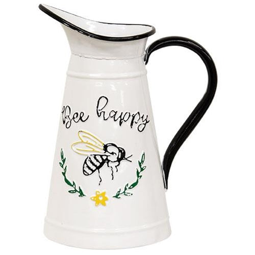 This Bee Happy Enamel Pitcher has a black handle and black trim for a contrast to the white finish. It reads, "Bee Happy" in distressed black lette...