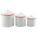 Enamel Canisters sell as a set of three. Canisters are food, oven and dishwasher safe. The small size measures 3" high by 3½" wide. The medium size measures 4" high by 4½" wide. The large size measures 5" high by 5" wide. Do not microwave.