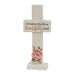 The A Life so Beautifully Lived Resin Cross brings a darling accent to thoughtful decor. The piece features the shape of a cross on a flat base with a textured white finish. A detailed, dimensional pink rose with green leaves adorns the cross. Black and pink text along the cross reads, “in memory of a life so beautifully lived.” Measures 4” high by 1.75” wide by .75” deep.