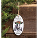 The Cowbells Ring Ornament is a tall, thin oval-shaped wooden slice ornament with a distressed white background. The ornament reads "Cowbells ring...are you listening?" in black lettering and displays a black and white spotted cow with a poinsettia crown. The top of the ornament includes a jute rope loop, perfect for using to display the ornament on a Christmas tree during the holiday season. Measures 4.75" high by 2.5" wide by .25" deep.