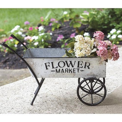 Vintage Flower Market Cart is a galvanized metal tabletop accent with weathered white paint and distressed detailing. It has embossed lettering tha...