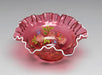 Cranberry glass bowl with white ruffled edge and hand-painted floral design in soft pink and green tones. A charming vintage-style accent that blends vivid color, artistry, and timeless glass craftsmanship.
