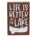 The Life is Better Lake Sign is a decorative box sign with a brown painted finish and worn edges. The sign reads “Life is Better at the Lake” in white lettering and features white canoe and paddle artwork. This sign makes a perfect addition to a lake house, displayed freestanding on a shelf or table, or hanging on a wall. Measures 7” high by 5” wide by 1.5” deep.