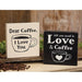 The Love Coffee Block Sign is an assortment of two wooden quote signs with neutral colors and a coffee theme. One sign is black and reads "All you need is love coffee" in white stamped letters, displaying coffee mug art. The second sign is cream and reads "Dear Coffee, I Love You." in black stamped letters, displaying coffee mug art. Each sign measures 6" by 6" and .75" deep. Please note: This Item features a variety of designs which are each sold individually (not as a set). Please add a note in your cart to indicate your preference.