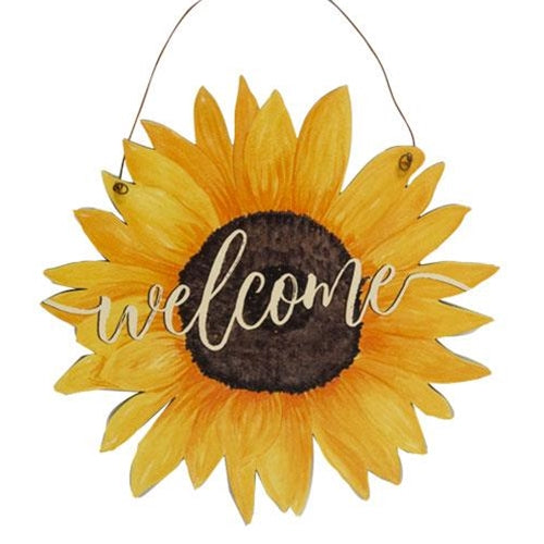 Sunflower Welcome Sign is a wooden sign with a sunflower-shaped design. Sign is painted yellow and reads, "welcome" in white lettering. Sign hangs ...