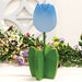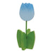 The Blue Wooden Dimensional Tulip Sitter is a bright, unique accent for springtime decor. The sitter boasts a freestanding base made up of four tulip leaves arranged in a square shape. A long wooden stem connects the leaves to the wooden tulip blossom, which features detailed carved design and dimensional blue coloring. Measures 9” high by 4” wide by 4” deep.