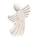 The Distressed White Wooden Angel Sitter is a beautiful accent perfect for rustic, farmhouse, or minimalist winter decor. Crafted from wood, the sitter depicts the silhouette of an angel with a round head, wide wings, and a skirt. A pleated texture adds a unique quality to the body and wings. The figure is painted a matte white shade with light distressing for a stylish look. Measures 9.25” high by 6.75” wide by .75” deep.