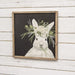 Sparkle Floral Crown Bunny Sign is a wooden sign with an animal print. Print has a lightly distressed frame and it depicts a white rabbit with a floral crown with a black backdrop. It has a sawtooth hanger at the back and it measures 16" high by 16" wide by 1" deep.