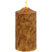 Burnt Ivory Flicker Flame Timer Cake Pillar is an electric pillar candle coated with rustic wax in a warm burnt mustard shade. The realistic flame gently flickers to enhance decor with a cozy glow. A convenient timer function automatically turns the candle off after 6 hours, then back on after 18 hours. The pillar requires 3 AAA batteries, which are not included. Measures 6" high by 3" in diameter.