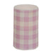 The Pink Gingham Pillar is a decorative pillar candle featuring a pink and white gingham pattern. The candle has a soft white glow when lit, offering a cozy ambience for the home during the Spring and Easter season and functioning on a 6 hours on/18 hours off timer. Pair with a candle ring or mat and display on a tray, riser, shelf, or table. Measures 5” high and 3” in diameter. Requires 3-AAA batteries (not included).