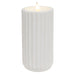 White Fluted Pottery LED Candle is an LED-powered pillar candle in a ceramic holder that suits rustic, farmhouse, or minimalist decor. The candle holder features a slim shape with a fluted texture in a solid white shade with light distressing. Unscented white wax fills the candle and a white artificial flame flickers with warm LED light for a realistic effect. A switch allows for a convenient timer function or simple on-and-off. The candle requires 2 AA batteries, which are not included. Measures 6" high by 3" in diameter.