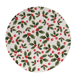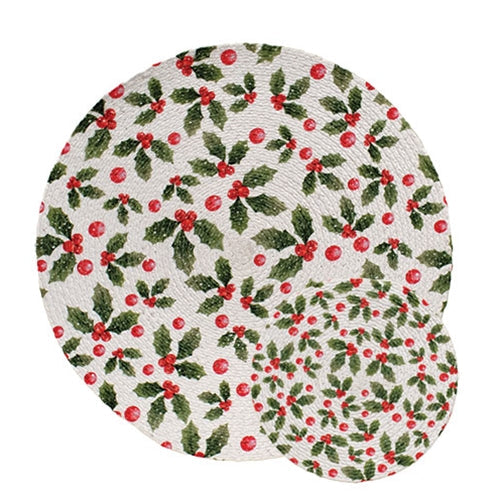 Holly Placemat & Trivet are a set of tabletop textiles adorned with festive allover design. Made from woven white fabric, the placemat and triv...