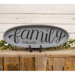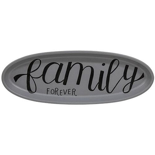 The Family Forever Tray is a decorative wooden tray in a long oval shape with a neutral gray painted finish. The tray reads "family forever" in fan...