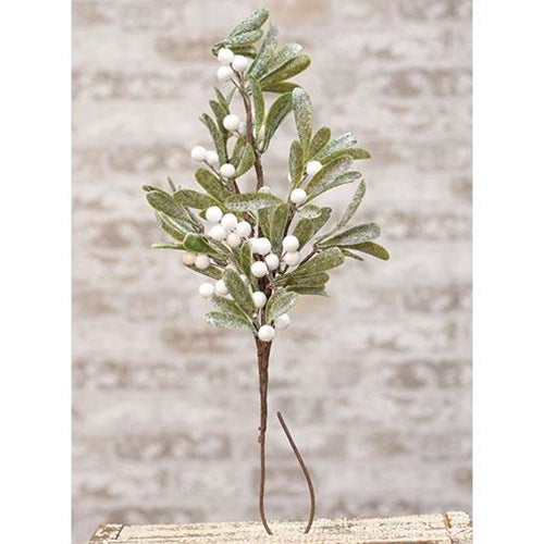 Frosted Mistletoe Pick is a festive winter floral that features green plastic leaves and white foam buds, covered in a healthy coating of silver gl...