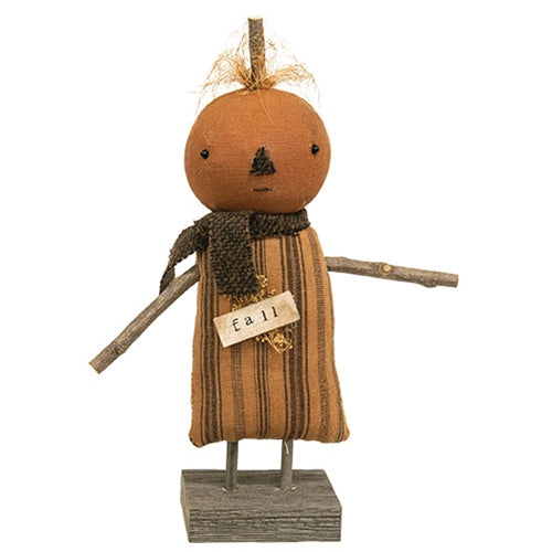 Gertrude Pumpkin Doll is a primitive plush doll set on a wooden base. Gertrude wears a striped dress, brown scarf, and wooden tag that reads, fall....