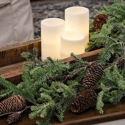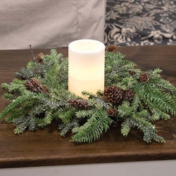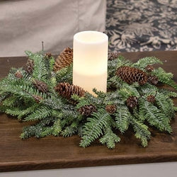 The Glittering Millwood Ring is a decorative greenery candle ring with a brown twig-like base. The ring is full of textured pine branches and rusti...